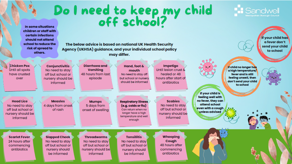 If you do keep your child at home, please contact us as soon as possible on the first day of absence and every day thereafter until your child is well enough to return to school, either by sending us an email to gb.enquiry@greatbridge.sandwell.sch.uk, telephone the school office on 01215571526 or text 07507 282984. If your child is well enough to go to school but has an infection that could be passed on, such as a cold sore or head lice, let their teacher know.